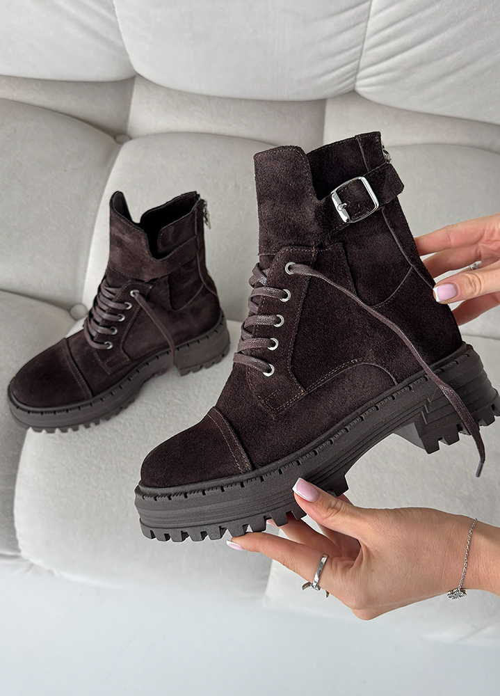 Ботинки берцы женские замшевые brown с пряжкой 8545-28 — универсальная модель для стильных и практичных образов. Натуральная замша премиум-класса, современный дизайн и надёжная подошва обеспечивают комфорт и устойчивость в любую погоду.
